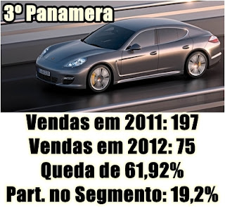 O segmento de Sedãs de Luxo ficou bem dividido quanto ao assunto de quem aumentou suas vendas e de quem caiu em relação à 2011! Enquanto dois modelos subiram em relação à 2011 dois caíram! Entre os modelos que aumentaram suas vendas em relação ao ano de 2011, estão: O Audi A6 com 72% e o Mercedes-Benz CLS com 19%! Já os modelos que tiveram queda nas vendas estão: O Porsche Panamera com 62% e o Audi A7 com 41%! Mas não são 5 modelos, e o que sobrou? Pois bem, a Hyundai lançou neste ano o Equus, o seu modelo top de linha! Em 2011, o segmento de Sedãs de Luxo vendeu 457 unidades, contra 390 de 2012, um queda que tem culpa, sim, ele, o IPI!